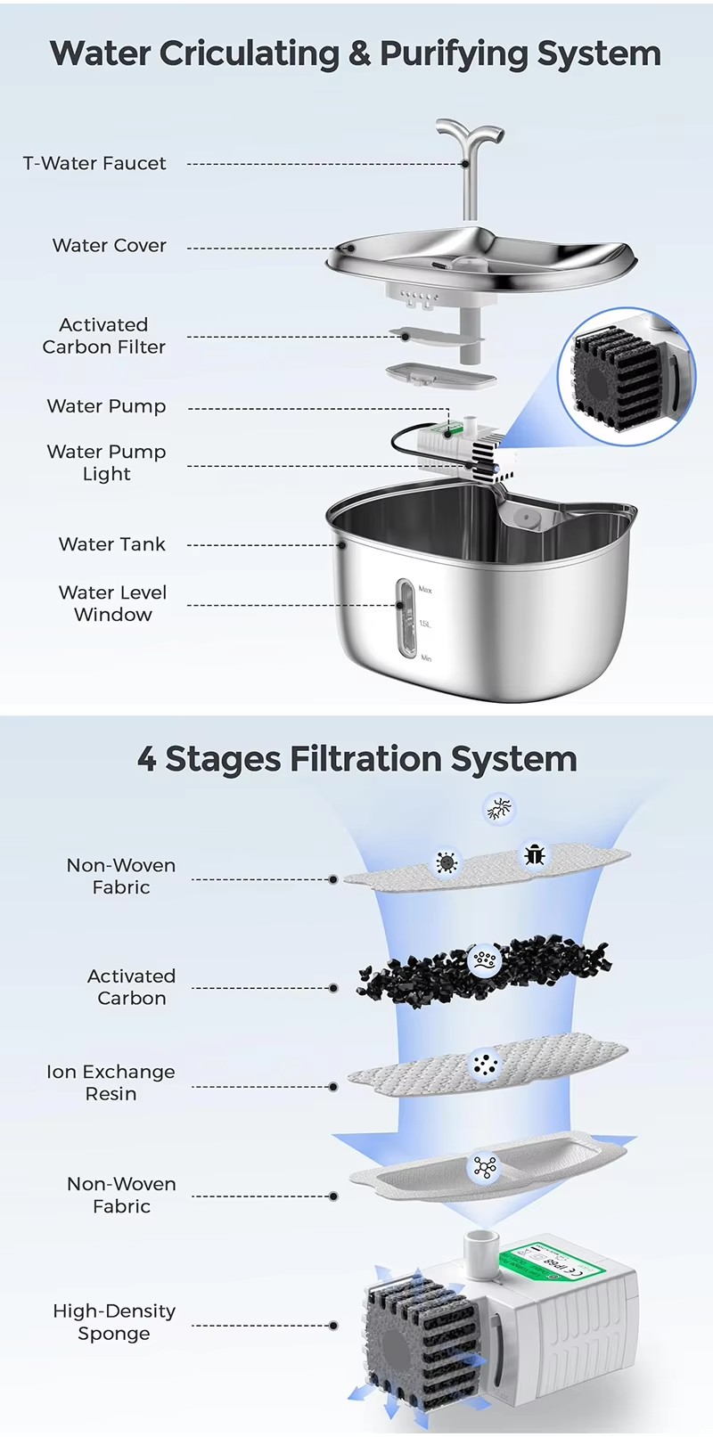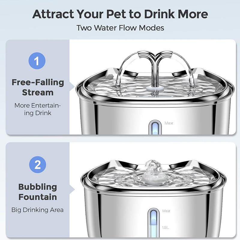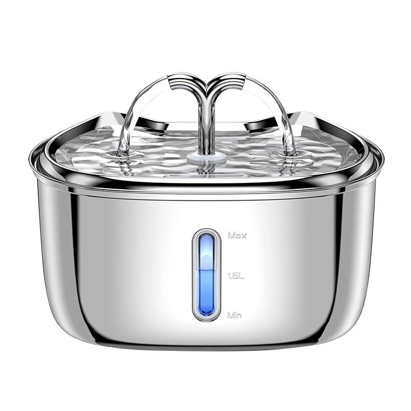2.5L Stainless Steel Pet Water Fountain, Two Water Flow, Ultra-silence, 4 Stages Filtration System